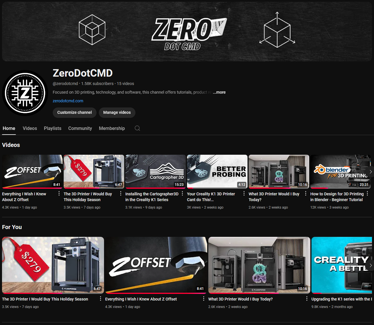 This ZeroDotCMD YouTube is Focused on 3D printing, technology, and software, this channel offers tutorials, product reviews, and comprehensive guides on printer modifications. The content is designed to help viewers enhance their 3D printing setups and deepen their knowledge of the tools and technologies involved.